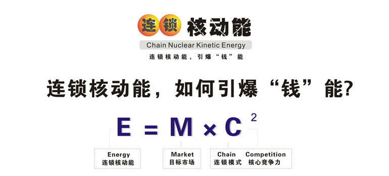 ,這是世界著名的愛因斯坦能量公式?;趷垡蛩固沟南鄬φ摵湍芰抗?,產(chǎn)生了原子彈和核電站,今天的人類太空實踐證實了愛因斯坦理論的正確性,人類因此發(fā)生了翻天覆地的變化。在愛因斯坦的能量公式中,M是質(zhì)量,C是光速,當(dāng)速度為光速時,即使很小的質(zhì)量也能轉(zhuǎn)化為非常大的能量。 廣州采納企業(yè)管理顧問有限公司首席咨詢師陳宏創(chuàng)建的的連鎖核動能理論(全名:連鎖內(nèi)核能量裂變激增理論)是以愛因斯坦的能量公式為基礎(chǔ)創(chuàng)建,但其含義和指向是不同的:M=目標(biāo)市場(Market),C1=連鎖模式(Chain),C2 =核心競爭力(Competition),其理論意義是,企業(yè)找準(zhǔn)了目標(biāo)市場,以連鎖的方式經(jīng)營,核心競爭力越大,推動其發(fā)展能量就越大。 連鎖核動能理論如何幫助連鎖企業(yè)“引爆錢能”快速發(fā)展?我們用深入淺出的圖形表達(dá)方式對該理論進(jìn)行分層闡述: